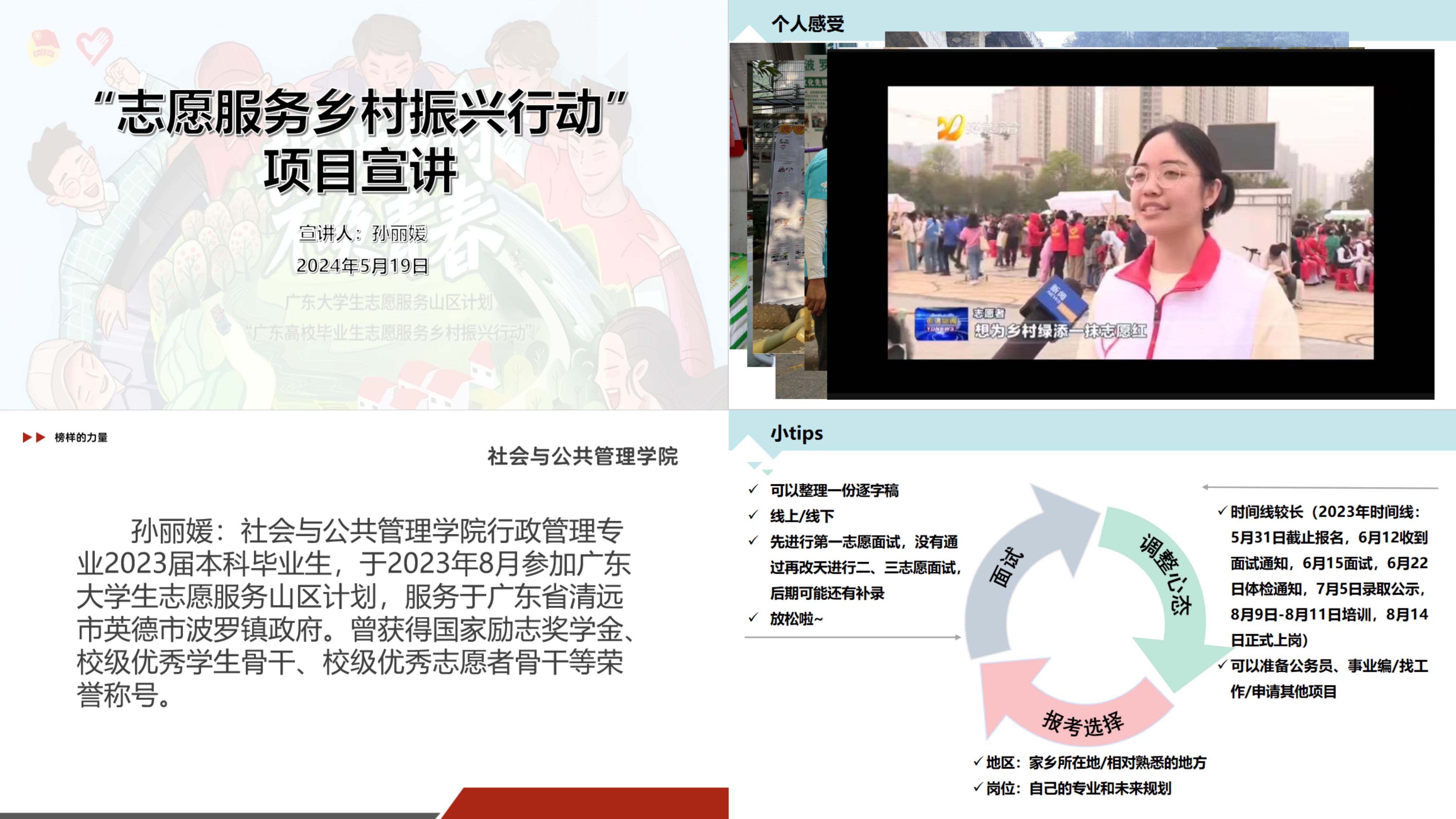 第一位分享人是来自英国正版365官方网站行政管理专业的2023届本科毕业生孙丽媛,于2023年8月参加广东大学生志愿服务山区计划,目前服务于广东省清远市英德市波罗镇政府的她首先围绕招募对象及条件、招募岗位和政策待遇等方面对广东大学生志愿服务西部(山区)计划进行了详细的介绍。对基层工作饱含热情的她结合具体工作内容为与会学生分享了服务心得,进一步激发了学生们投身基层项目的意愿。最后她还贴心展示了自主整理的面试技巧,鼓励应届毕业生们积极调整心态,踏实走好人生的每一步。