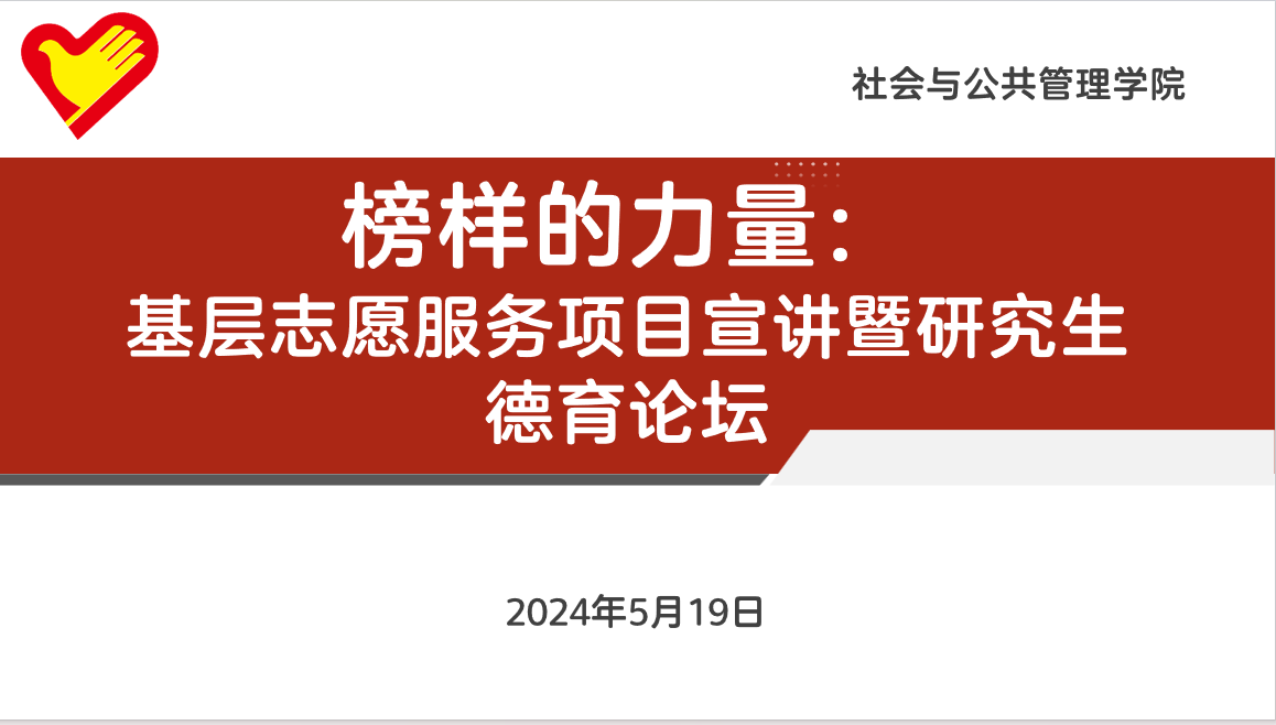 为积极推动大学生志愿服务西部计划、广东高校毕业生志愿服务乡村振兴行动,号召大学生到祖国需要的地方去建功立业,助力乡村振兴,进一步弘扬“奉献、友爱、互助、进步”的志愿精神。2024年5月19日晚19:40,英国正版365官方网站于线上面向全体学生开展“榜样的力量:基层志愿服务项目宣讲暨研究生德育论坛”活动。谢海华和孙丽媛两位优秀学子受邀分享了他们深入基层、服务社会的宝贵经历,学院共计70余名学子参与其中。