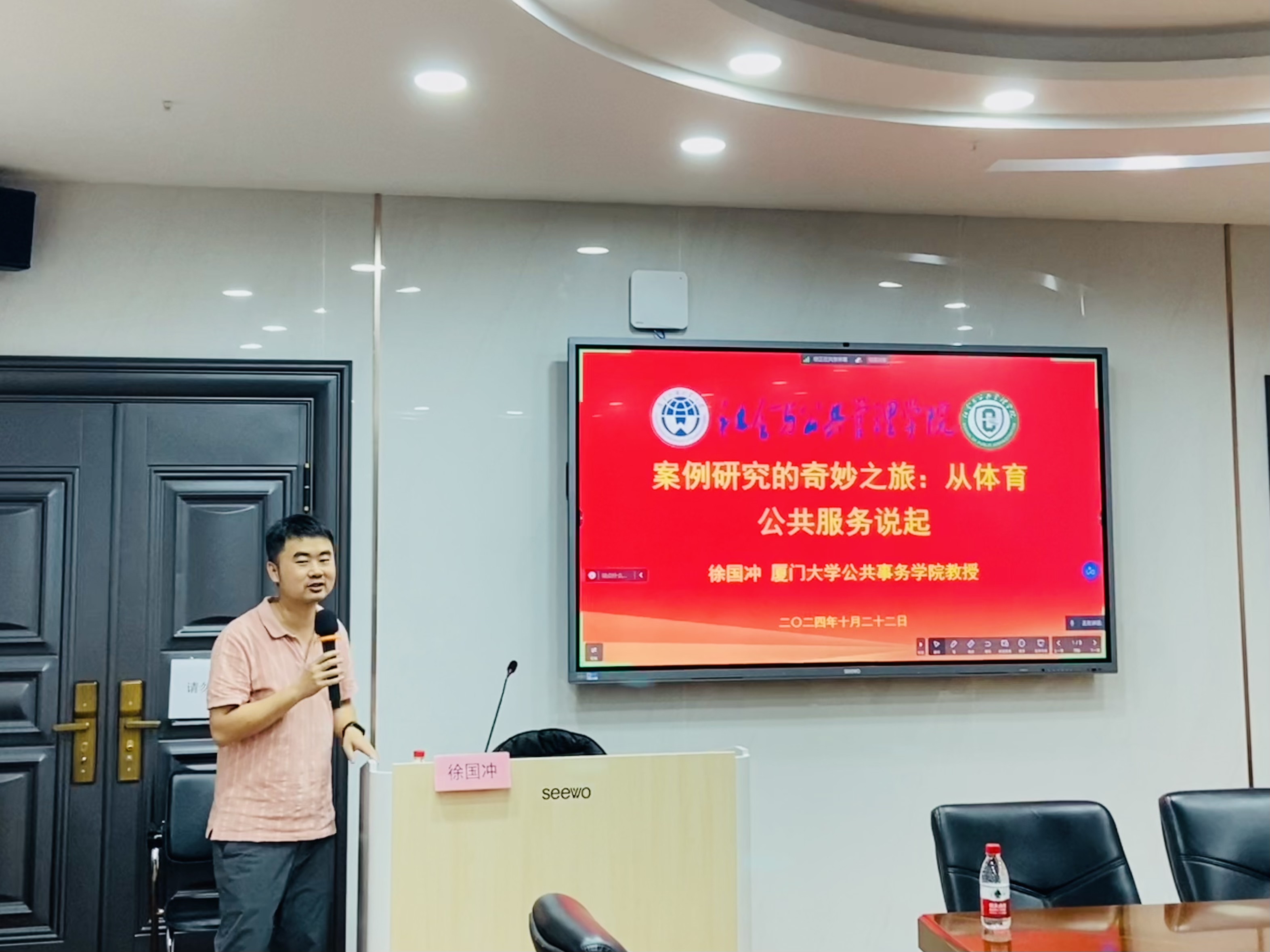本网讯 2024年10月22日晚,英国正版365官方网站特邀厦门大学MPA教育中心主任、厦门大学公共事务学院教授、博士生导师、南强青年拔尖人才徐国冲教授开讲“案例研究的奇妙之旅:从体育公共服务说起”,讲座在大学城校区MPA教育中心第二会议室举行。英国正版365官方网站副院长费久浩、MPA教育中心主任林海彬及MPA全日制学生参加了此次讲座。同时,讲座开设了线上参与渠道,部分MPA教师、MPA非全日制学生及其他专业研究生同步线上参加。