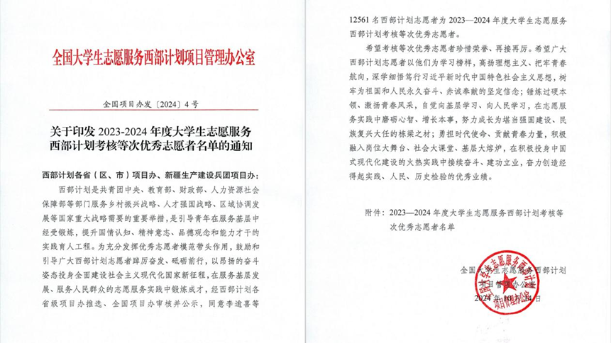 近日,西部计划全国项目办印发了《关于印发2023-2024年度大学生志愿服务西部计划考核等次优秀志愿者名单的通知》,经西部计划各省级项目办推选、全国项目办审核并公示,我校共有8名志愿者获评全国西部计划考核优秀等次志愿者,分别是:经济贸易学院李枚忆、商学院成梦嫣、西方语言文化学院祝婉婷、亚非语言文化学院朱毅晖、法学院叶洁双、国际关系学院黄奕涵、英国正版365官方网站孙丽媛以及信息科学与技术学院高海丽。