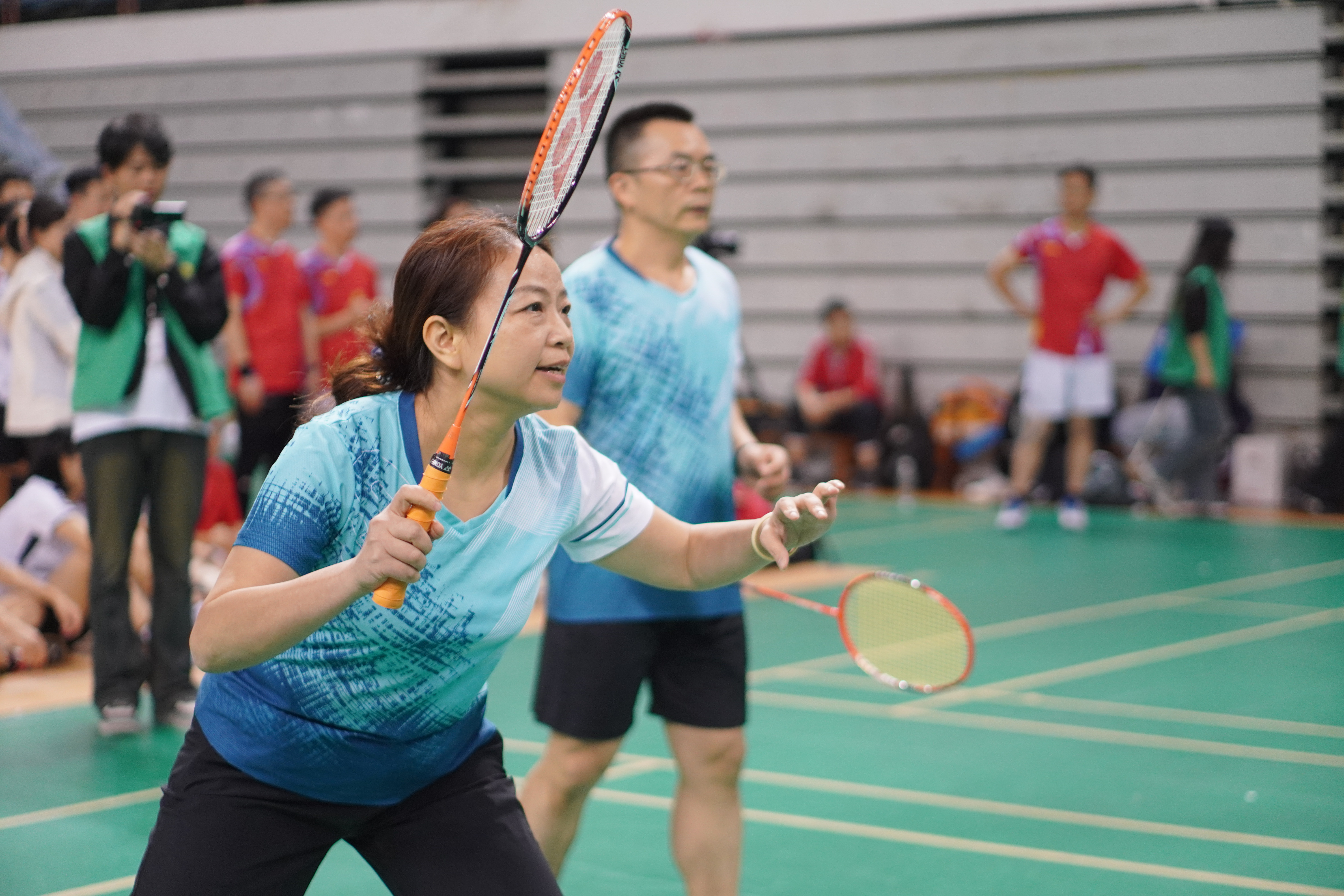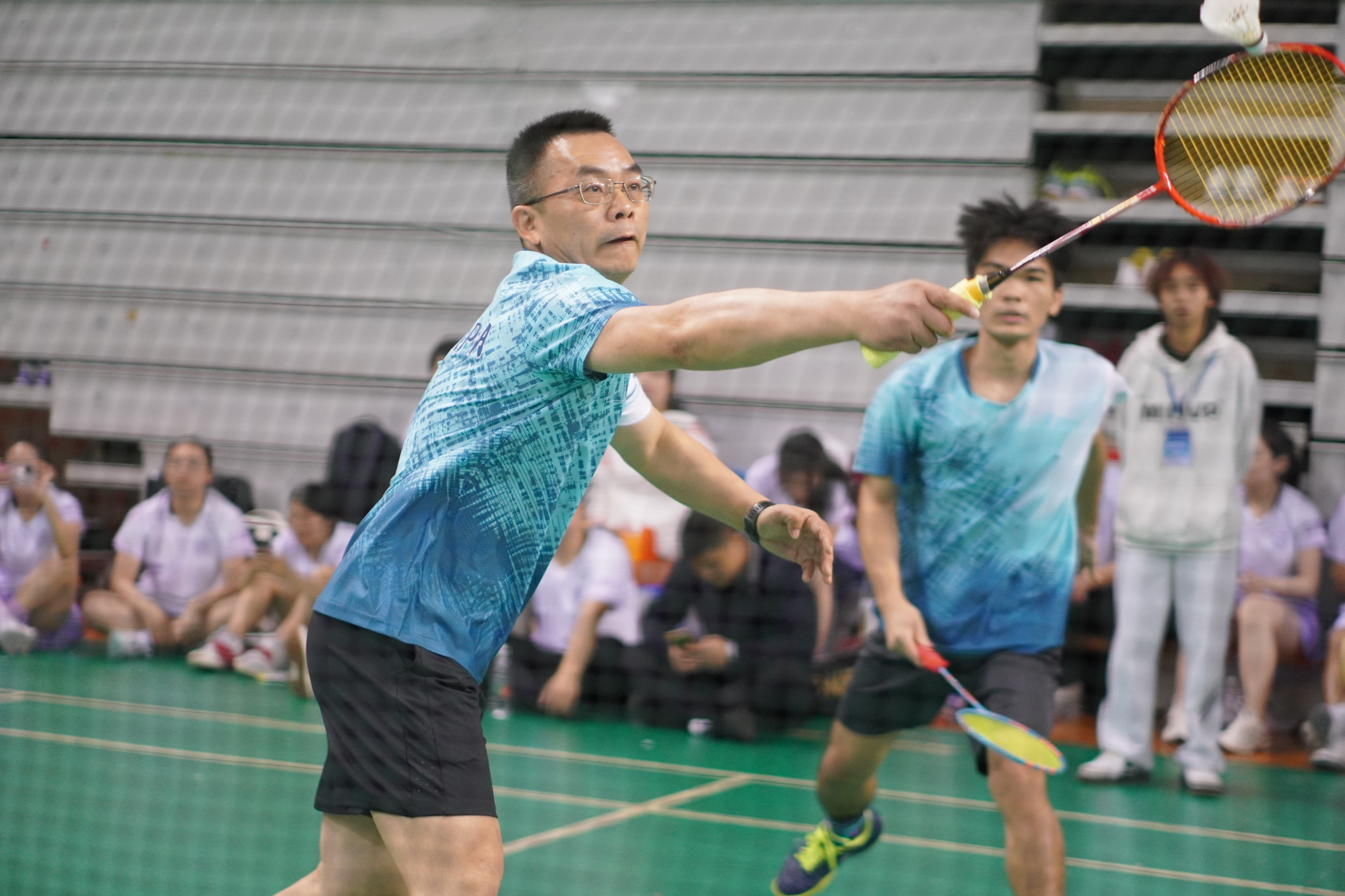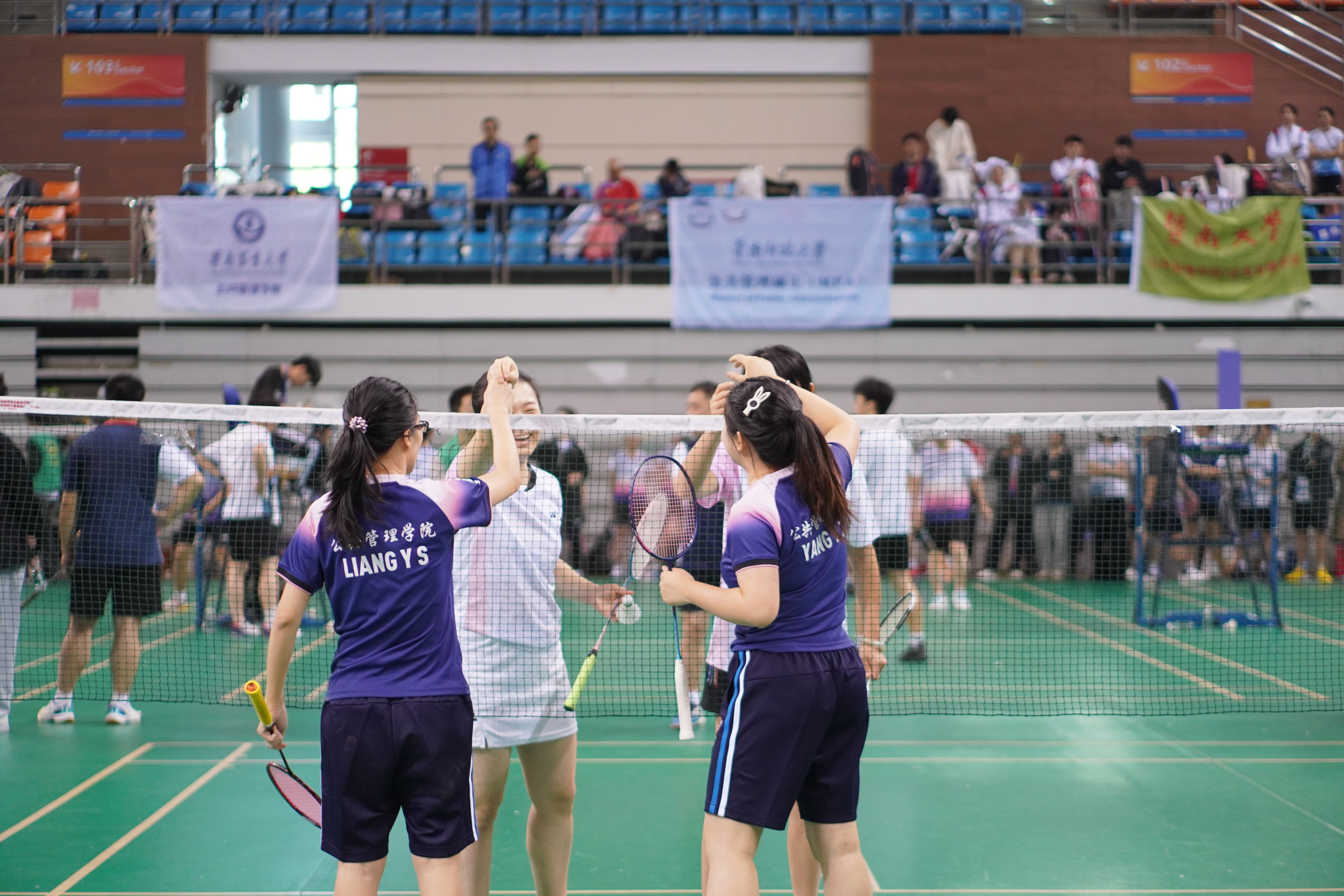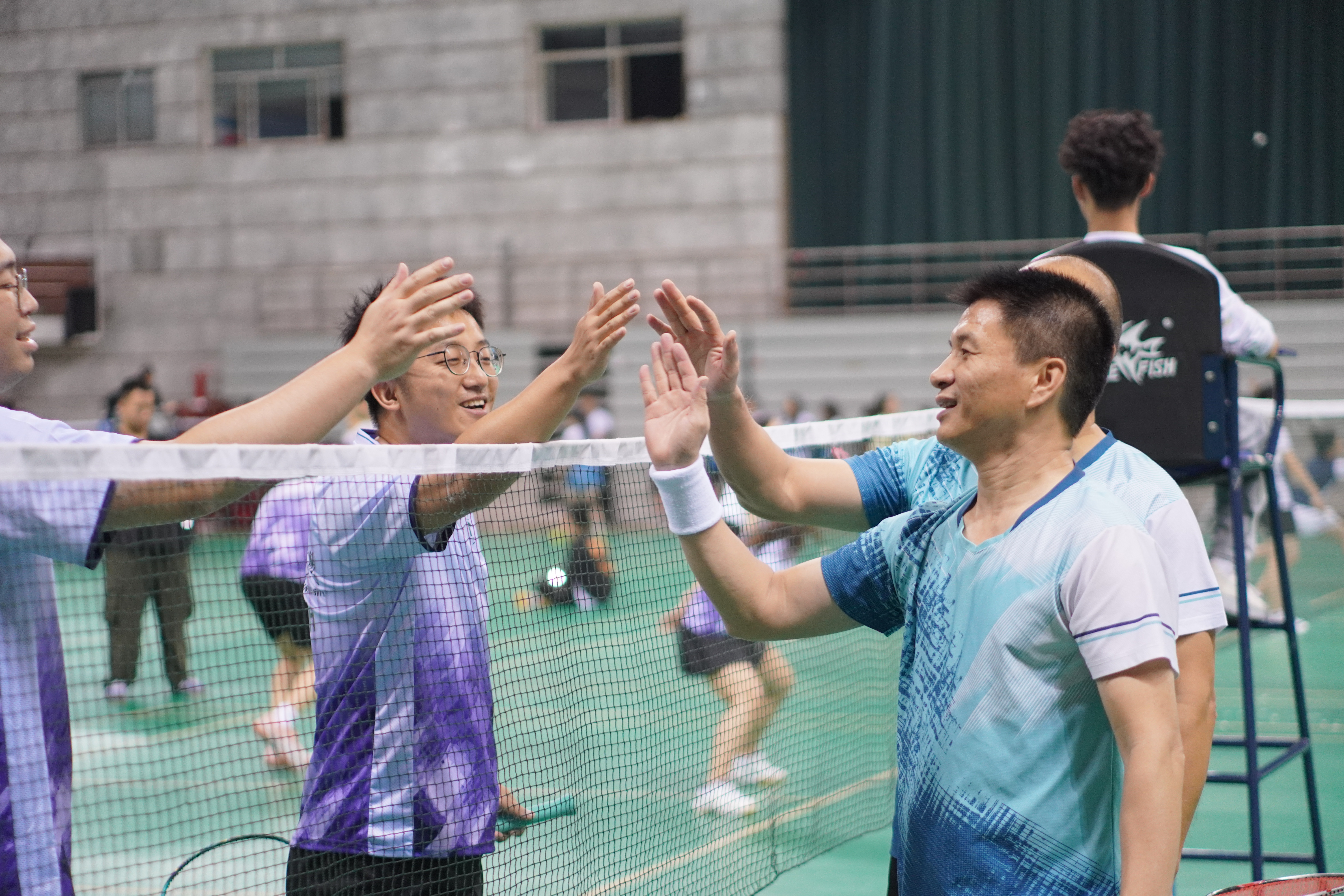在比赛中,各校院领导们相互切磋,默契配合,展现出团队协作的魅力。每一次精准的击球、每一次精彩的扣杀,都引发了观众们的阵阵喝彩与掌声。赛场上,欢笑与竞争交织,友谊与激情碰撞,形成了一幅生动的画面,让人感受到羽毛球运动所带来的无穷乐趣。