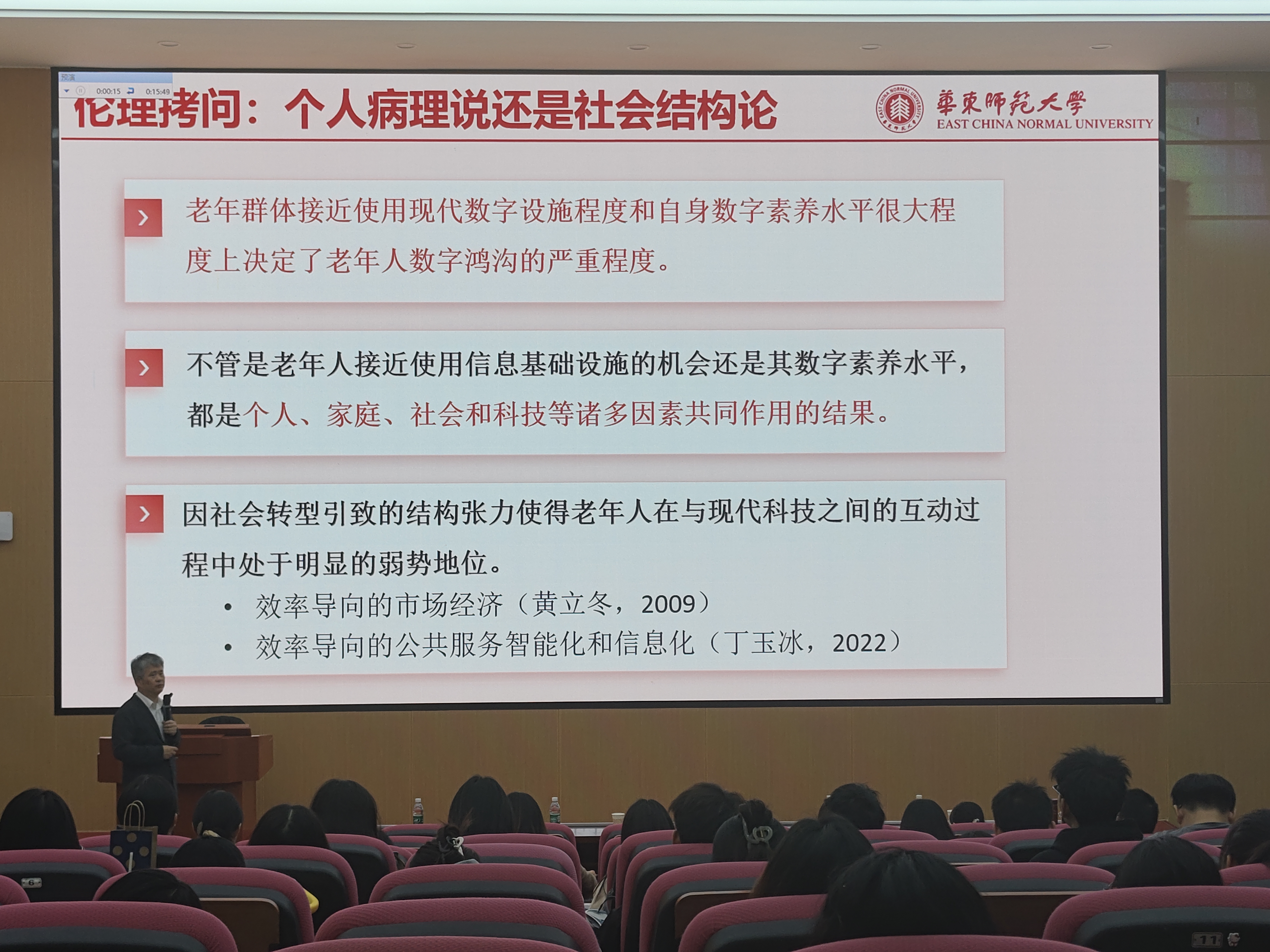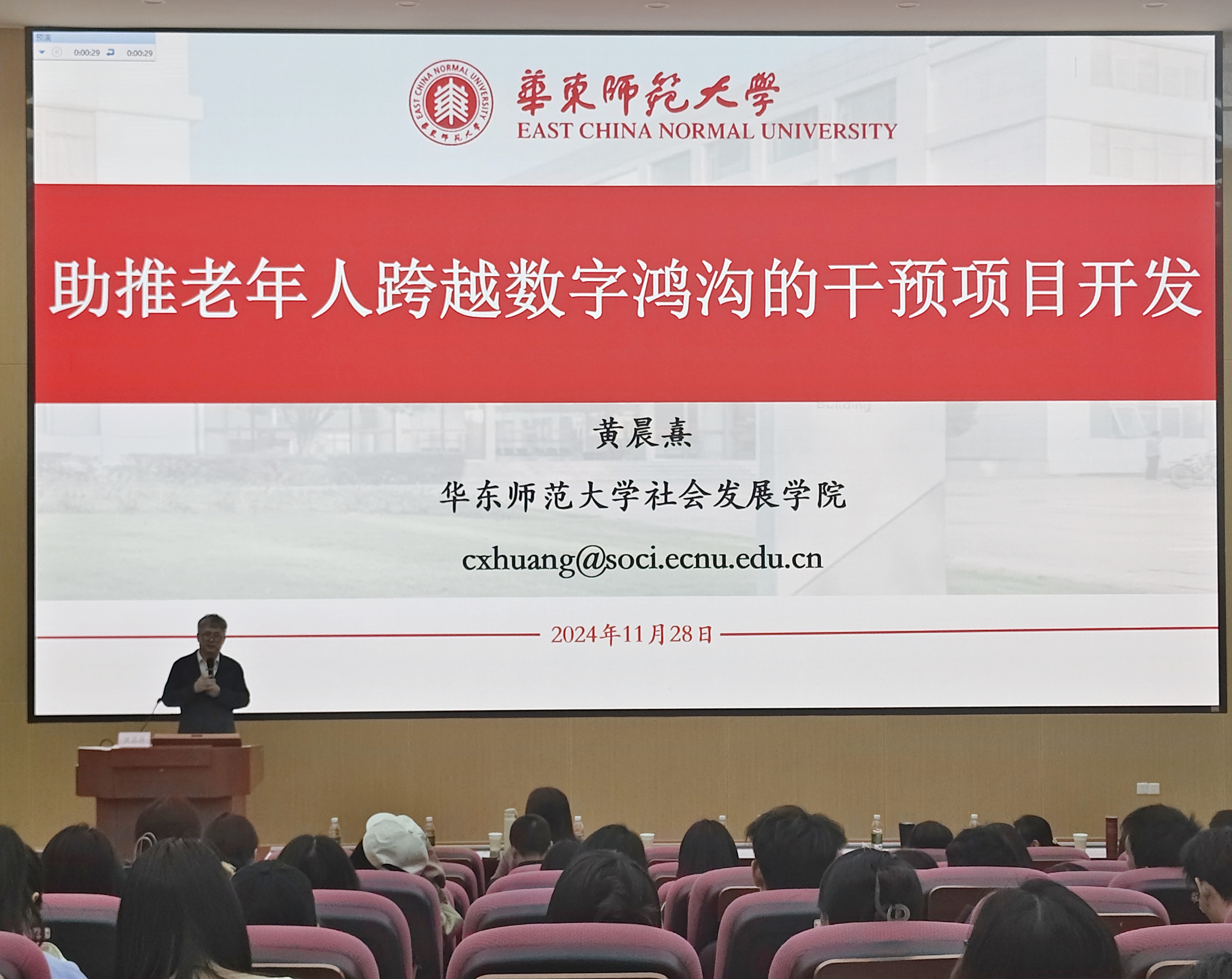 黄晨熹教授首先介绍了项目背景,指出国家和上海市在积极出台政策,致力于弥合老年数字鸿沟,提升老年人的数字素养。然而,通过深入的线上、线下调研,黄教授发现当前的老年数字教育活动存在社会性弱、可及性不足、成效难持续等问题。