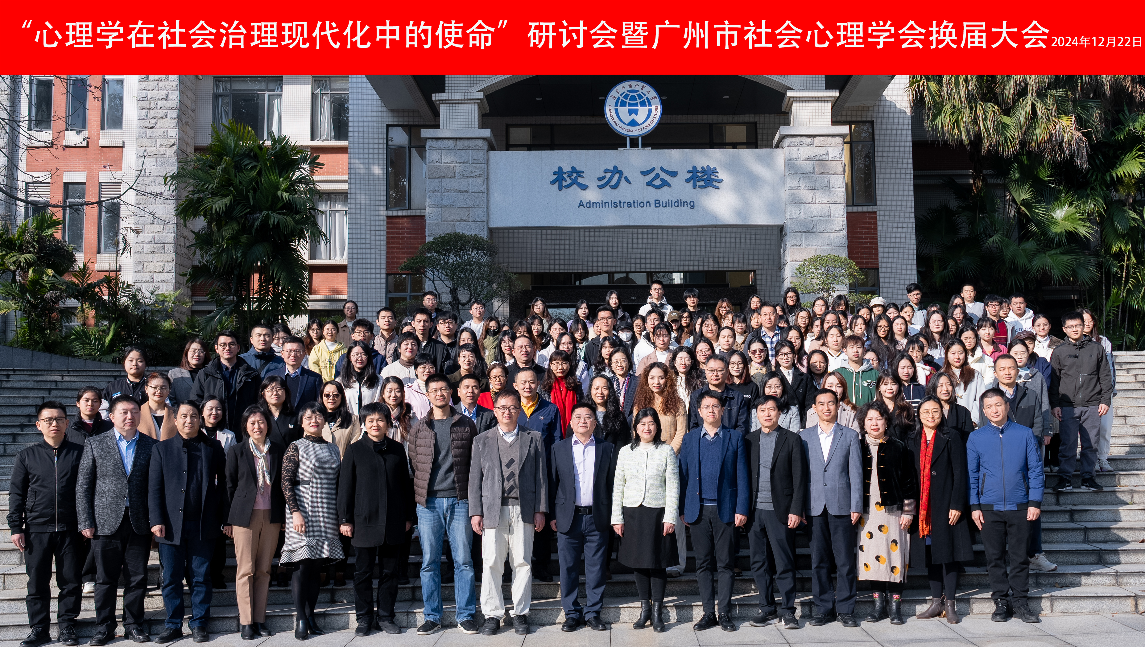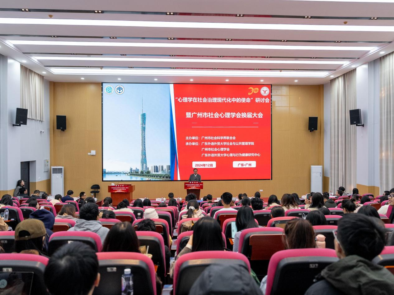 本网讯 为深入学习贯彻党的二十届三中全会,探讨心理学在助推社会治理现代化中的定位与作用,12月22日,由广州市社会科学界联合会主办,英国正版365官方网站、广州市社会心理学会、广东外语外贸大学心理与行为健康研究中心承办的“心理学在社会治理现代化中的使命”研讨会暨广州市社会心理学会换届大会在广东外语外贸大学举行。来自省内外高校专家学者、政府部门和社会服务机构实务工作者、学生共计200余人参加会议。