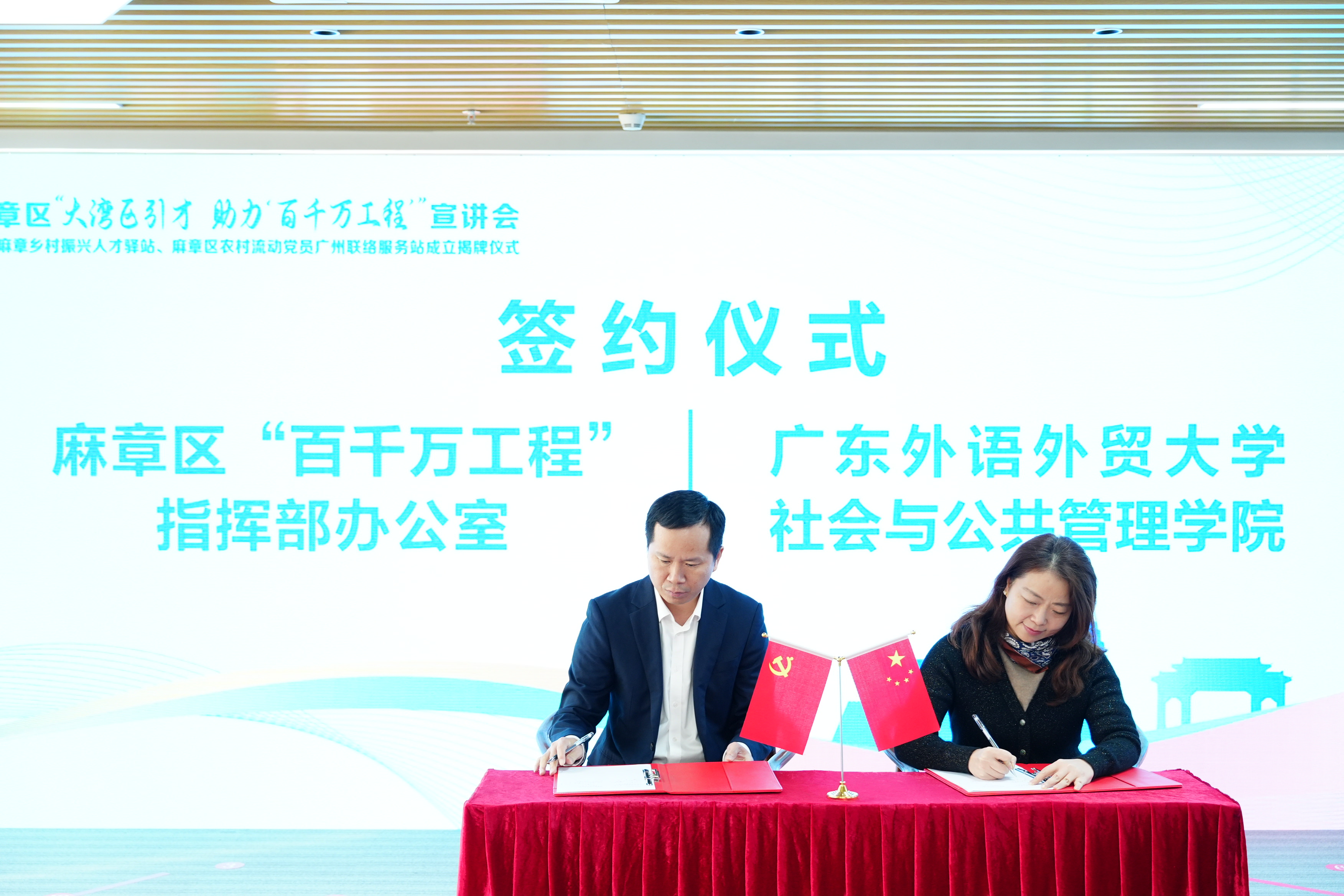 随后,涂斌院长出席广州市(湾区)麻章乡村振兴人才驿站、麻章区农村流动党员广州联络服务站揭牌仪式,并代表学院与麻章区“百千万工程”指挥部办公室签署“百千万工程”校地人才合作框架协议,推进校地双方在联合培养人才、输送使用人才、产生人才集聚效应等方面发挥更大作用,使双方的合作更上一个新台阶。