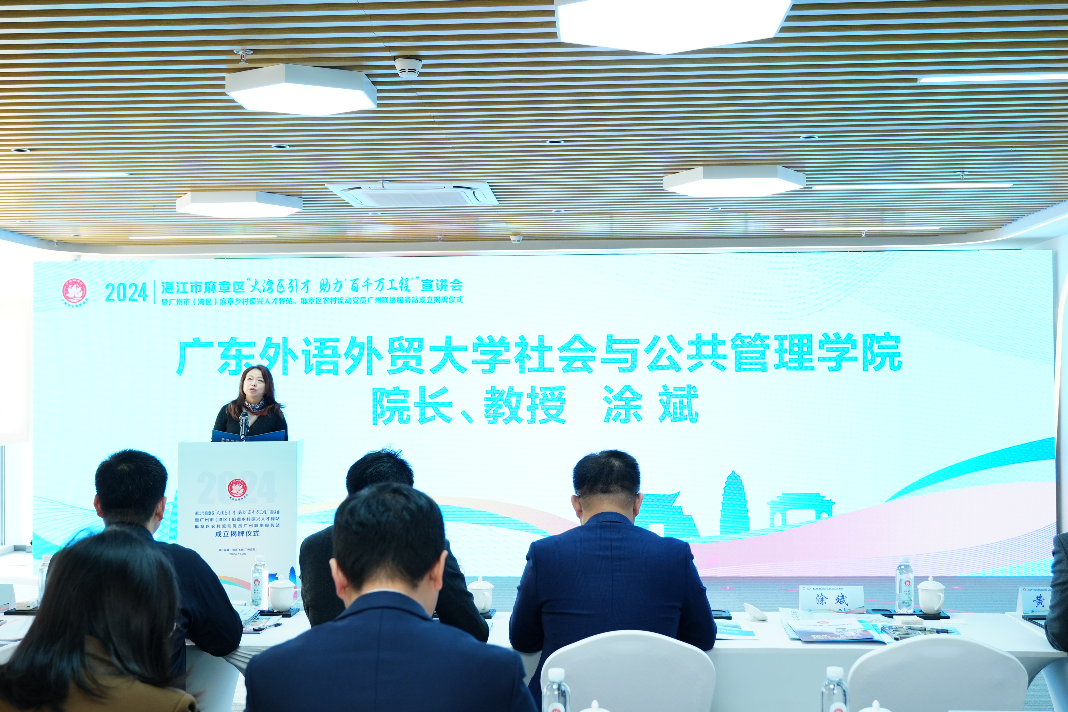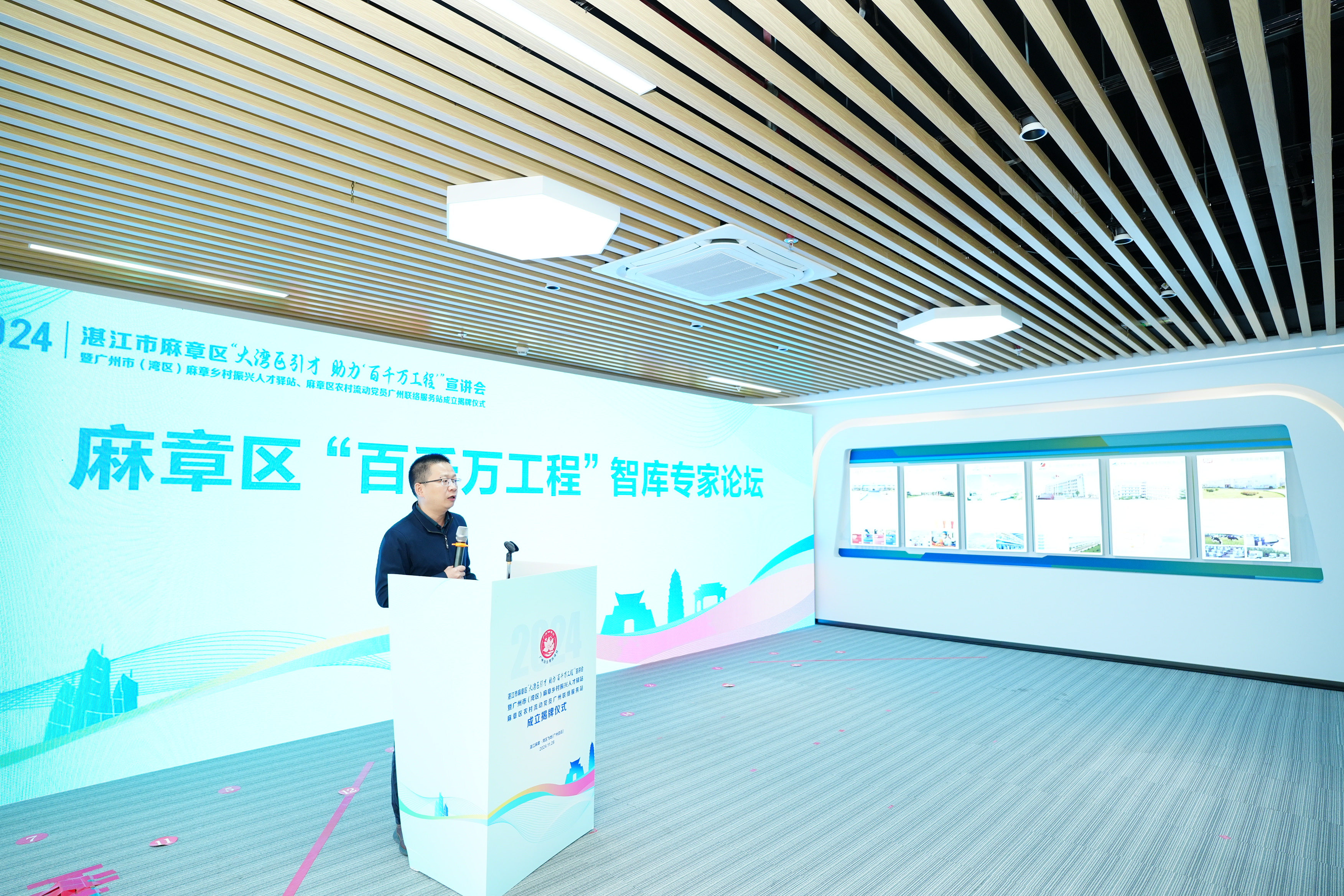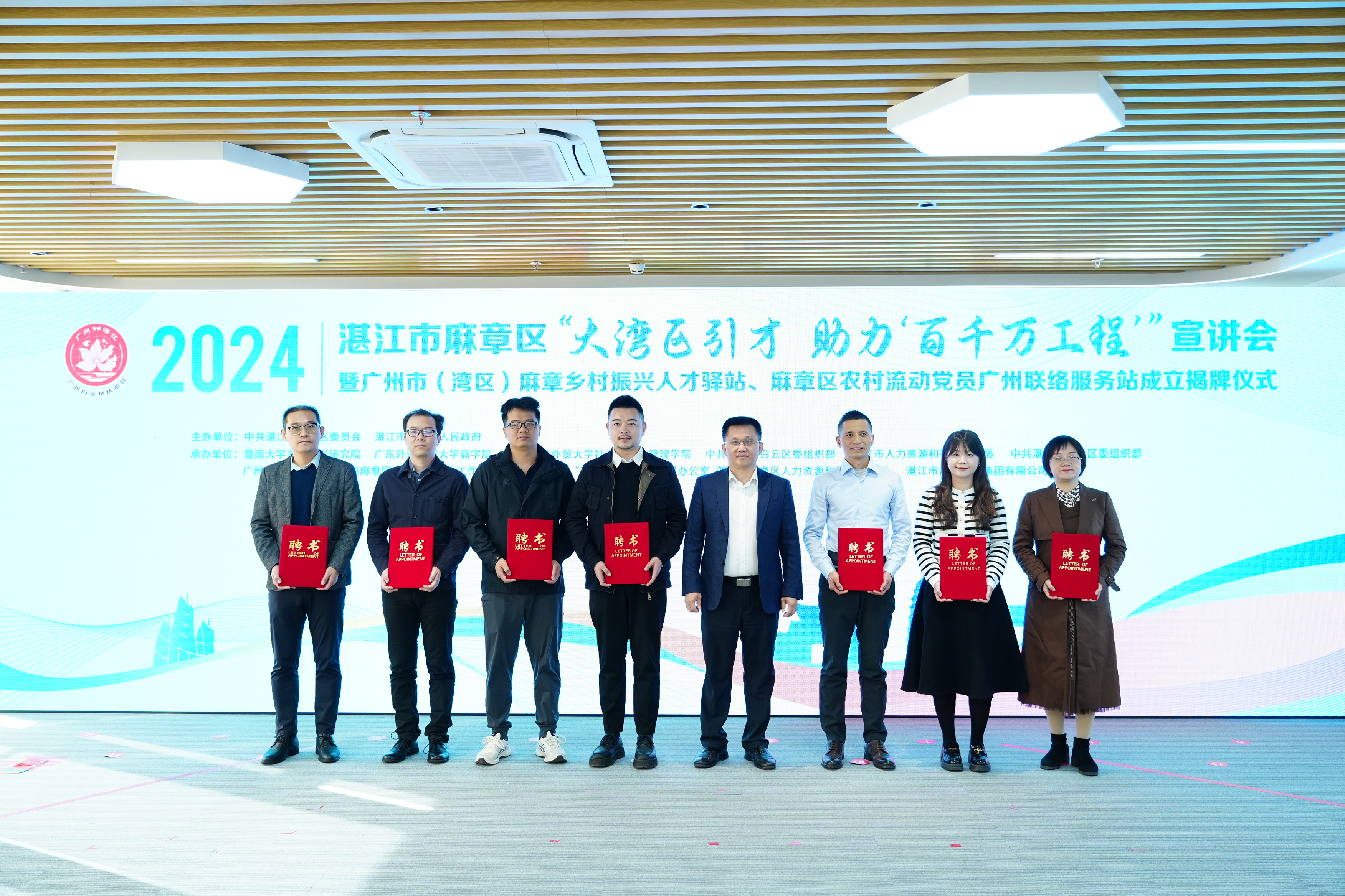 2024年11月28日上午,英国正版365官方网站一行受邀赴广州市白云区湛江麻章·湾区“反向飞地”推介中心参加由中共湛江市麻章区委员会、湛江市麻章区人民政府主办的麻章区“大湾区引才 助力‘百千万工程’”宣讲会暨广州市(湾区)麻章乡村振兴人才驿站、麻章区农村流动党员广州联络服务站成立揭牌仪式。