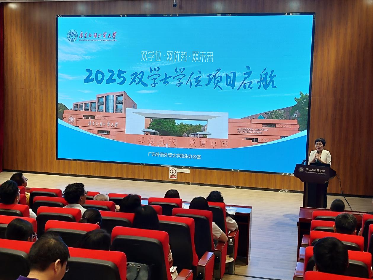 随后,招生宣传专场活动在中山市永安中学拉开帷幕。宣讲会上,邓丽君副部长作为主讲人,向到场的学生和家长全面且细致地介绍了我校 2025 年 19 个双学士学位项目高考招生情况。她从项目特色、课程设置、培养目标、就业前景等多个维度进行解读,着重强调了双学士学位项目在培养复合型人才方面的独特优势,以及为学生未来职业发展带来的广阔空间。