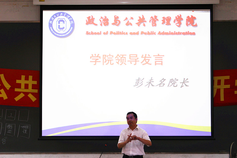 2014年9月15日上午10:30,政治与公共管理学院14级开学典礼在E204隆重举行。出席本次典礼的领导和嘉宾有:院长彭未名、行政管理系主任毛国民,应用心理学系主任张信勇、社会工作系主任陈胜、团委书记陈三峰,团委副书记王雯雯,学生会主席杜浩鹏,团学秘书长朱冬昱等。本次开学典礼由14级辅导员房瑞佳主持。
