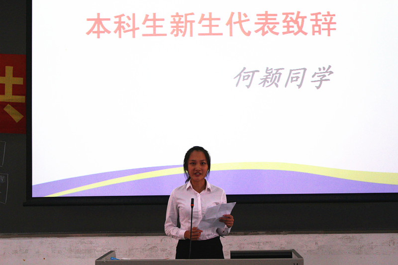 伴随着浩荡的国歌,14级开学典礼拉开了序幕。首先是院长彭未名发表讲话,他先代表学院的领导班子向全体新生表示热烈的欢迎。接着向所有的新生介绍了学院的具体情况,并用了两个字来形容学院发展的优势,小--转变快;新--跟着时代的脚步。在谈到对新生寄予的期望,他慷慨激昂说道:“握住现在和未来,相随相行!”把握现在就是在把握未来。话罢,赢得了在场各位一阵又一阵的掌声。