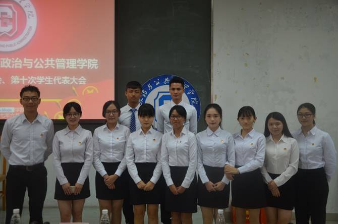 2017年6月8号在G207召开了政治与公共管理学院第八次团员代表大会、第十次学生代表大会。出席本次大会的嘉宾有法学院团委书记陈宇;金融学院2014级本科生辅导员龙志成;2015级辅导员陈璟明;政治与公共管理学院党委副书记邵兵;2016级辅导员白志华。