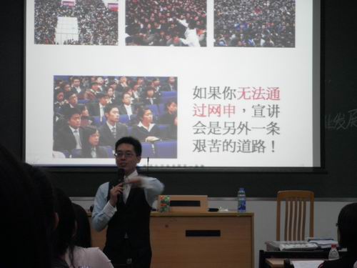 在讲座开始之前,郭丹锐老师的助理首先给同学们看了一个关于过来人的发展的视频,视频主要介绍了过来人这个就业指导机构的发展历程和该机构的宗旨及成就,并特别强调了要脚踏实地,超越自我,行健无疆的理念。通过视频,同学们对过来人的了解有了一个较深的认识,也勾起同学们对讲座的好奇,现场气氛非常热烈。