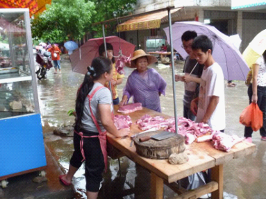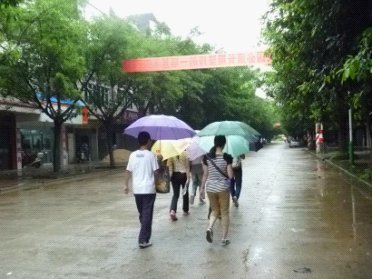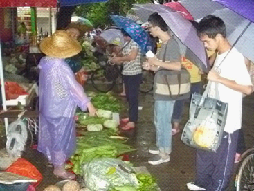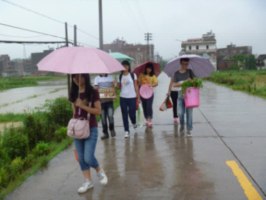 17日早上8点,除了留下来和其他队员大搞厨房卫生的2位组员,我们后勤组的其他9位成员齐齐出动,去购买当天中午和晚上要用的菜,以及调料等等。天公不作美——我们出发时,天下着中雨,所以我们都得撑伞步行20分钟到镇上的市场买菜。