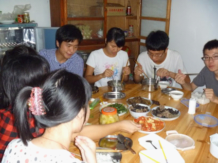 7月17日,也就是夏约队员们来到梅州市畲江镇中心小学的第二天,我们的后勤组就得开始我们下乡期间的主要工作——为夏约25位队员煮饭煮菜。所以,在16日晚上,我们就要决定第二天早上和中午各煮什么菜,然后是买什么菜,该买的菜各要买多少,由谁去买,还有语言障碍等等问题。为此,我们后勤组11个人开了个全体会议,经过近一个小时激烈的讨论,才解决以上问题。
