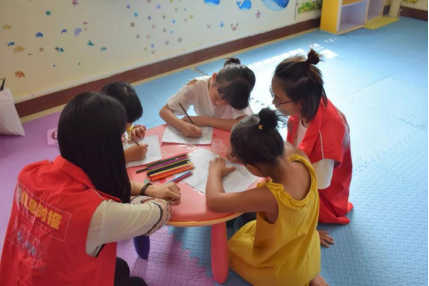 灯笼、气球、彩带……在志愿者们的布置下,增城区派潭镇家庭综合服务中心的活动室洋溢着满满的中秋节气息。“怎么样成为一个自信的人呢?”通过分组竞赛和游戏的形式,志愿者们给孩子们上了一节有趣的心理课。在志愿者的鼓励下,一个小女孩大方地自我介绍道:“我是一只熊。因为我今天穿的是黄裙子,而且我很可爱。”充满童真的话语,让在场的人不禁露出了笑容。除了心理课,志愿者们还为孩子们上了自选课,其中包括绘本、画画、书法、手工、零食盒子等内容,孩子们根据自己的兴趣选择了对应的课程,并且在志愿者老师们的教学下认真地学习与互动。时间虽然很短,但是,志愿者老师们用心地把课程教得尽善尽美。在课程结束时,孩子们依依不舍。