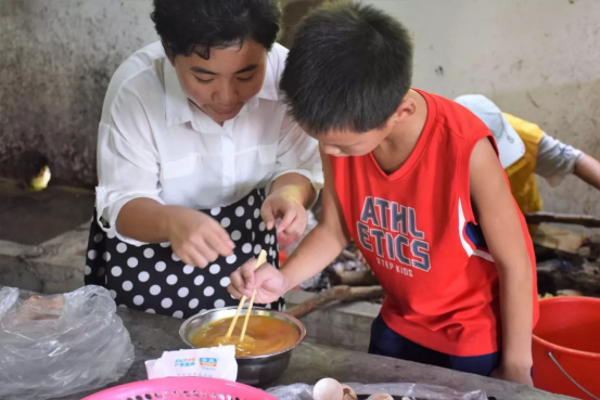 课程结束后,志愿者们一同前往镇上的活动室做菜聚餐。劈柴、生火、用大铁锅做菜……对于大多数志愿者而言,这都是新鲜事。即便如此,在志愿者们的努力下,80多人的饭菜就做出来了。菜式简单,但每一道都满含着志愿者们对孩子们的关爱。