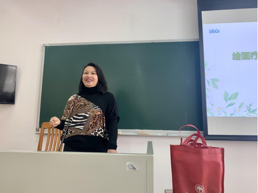 随后,徐娟老师就绘画疗法的概念与同学们进行了更深一步的交流。她介绍,绘画疗法是一种投射的技术,是可以通过绘画这种非语言的方法进行沟通的方式,在这个过程当中,当事人能呈现自己的潜意识,了解真正的自己,表达、调节自我的情绪,修复情感上的创伤,整合自我的人格。介绍完毕后,同学们以绘画疗法为焦点积极举手提问,徐娟老师耐心、细致地一一回答了问题,同学们在互动中进一步加深了绘画疗法的了解和认识。互动过后,徐娟老师还鼓励同学们主动、积极地去获取有关绘画疗法的信息,在实践中去学习更多的知识。