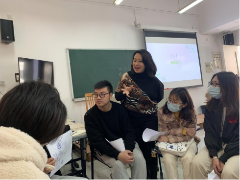 紧接着,同学们分成了六组,以小组的形式开展了绘画疗法的体验活动,同学们就“我是谁”、“我是如何成为自己的”、“未来的我”三个问题进行绘画。绘画完成后,每位同学在小组中分享自己的图画,其他组员就作品进行提问,双方在互动过程中深切感受绘画疗法。与此同时,徐娟老师和刘亚老师也积极地参与到每一组的分享与讨论之中,针对同学们在小组中的表现给出了自己的建议和看法,帮助同学们更加深入地体验绘画疗法的治疗过程。