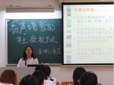 简单的引入之后,余老师进入了正题。从最简单的问候语说起,逐步深入,涉及了东西方不同的人际称呼礼仪,迎宾礼仪,交谈礼仪等。讲解过程中,余芳教授语言生动,情绪高涨,很好地调动了现场氛围。 她运用自身经历和生动的故事为例,讲解内容实用且丰富,同学们认真听讲,有的还做了笔记。
