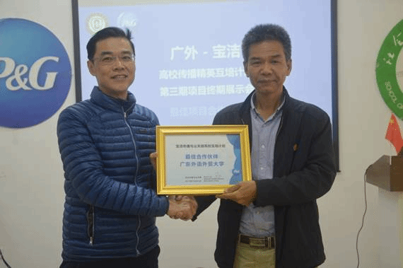 在许有杰先生致辞之后,他代表宝洁公司向广东外语外贸大学颁发最佳项目伙伴证书,高云坚书记代表广东外语外贸大学英国正版365官方网站接受证书。