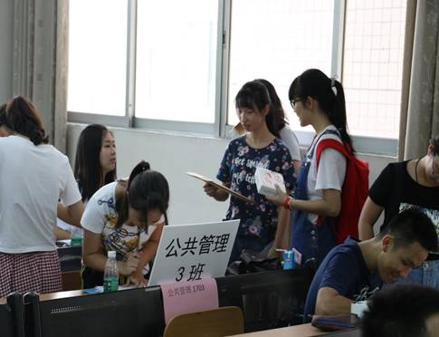 政管学院的院长彭未名、党委书记高云坚、副院长毛国民、党委副书记邵兵、团委书记(15、16级辅导员)白志华、公共事业管理系主任陈胜以及17级辅导员房瑞佳在注册现场负责制定迎新工作的宏观目标,他们不仅对新生们加以引导而且给予新生们支持与鼓励。在学院领导的支持与带领下,政管学院的迎新工作目标明确,各迎新工作人员得以高效完成各项工作。