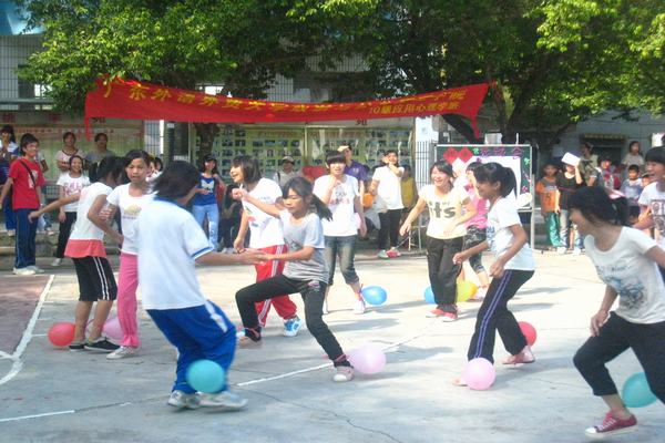紧接着,初中组开始了“踩气球”比赛,两组对垒,一声哨响,同学们纷纷向对方阵营跑去,企图踩破对方脚上的气球。如果不幸“阵亡”,被踩破了气球,就要退出比赛场地,最后在规定时间内剩下气球总数最多的一队获胜。正在多数同学你追我赶不亦乐乎之际,也有的同学采取了保守政策,尽量躲开人群以保护自己的气球。在游戏中,同学们虽姿态百出,但仍充满欢声。3分钟后,游戏告一段落,D班1队和2队共同取得了胜利。