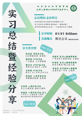 根据应用心理专硕人才培养计划,实习实践的选定导向是应用心理学专业的实际应用,同时可以满足管理心理和社会心理与服务方向的职业需求,使得应用知识解决实际问题的能力和个人综合素养均能得到提高,达到应用心理学专业的一般基础理论与实际应用相结合。根据此导向,2019级应用心理专硕的25名同学在学院推荐、导师引荐或者自我举荐之下分别前往企业、医院和学校进行了不少于4个月的实习实践。因此,本次分享交流会共分为企业、医院和学校实习组三组,分享交流会以不同工作类别依次进行专题分享,并设有答疑时间供不同就业需求的同学有针对性的进行提问交流。