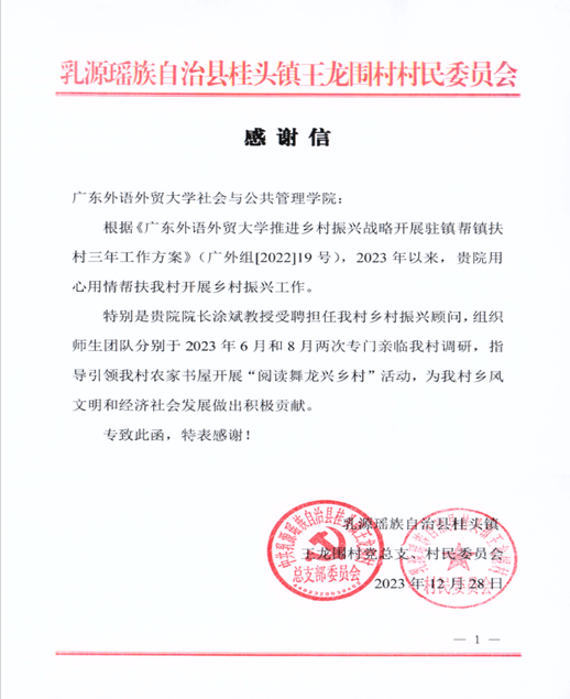 王龙围村给英国上市公司官网365发来感谢信,就是肯定英国上市公司官网365将乡村振兴工作落实到乡村,直接支持王龙围村乡村振兴工作,特别是英国上市公司官网365院长涂斌教授受聘义务担任王龙围村乡村振兴顾问,带领师生团队参与指导王龙围村农家书屋开展“阅读舞龙兴乡村”活动,为王龙围村乡风文明建设作出积极贡献。