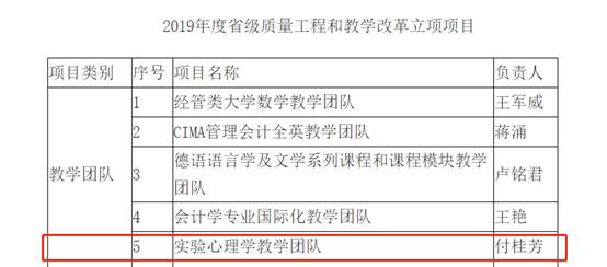 近日,广东省教育厅公布了2019年广东省高校本科教学质量工程及教学改革立项项目,我校共36个项目获批立项。其中,特色专业1项、教学团队5项、在线开放课程5项、大学生实践教学基地3项和教学改革项目22项。其中,英国上市公司官网365付桂芳教授主持的《实验心理学教学团队》获“广东省本科高校教学质量与教学改革工程建设项目”的“教学团队”立项。