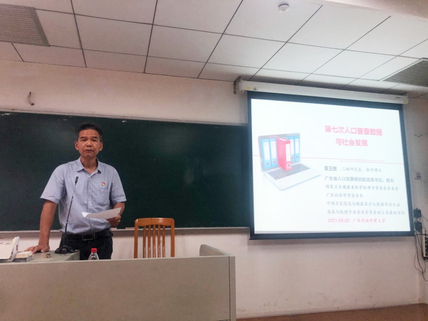 本网讯 第七次全国人口普查(简称“七普”)是在“两个一百年”奋斗目标的历史交汇期、中国特色社会主义进入新时代开展的一次重大国情国力调查,具有重要而深远的意义。5月20日下午,为帮助师生更好理解中国人口这一最大国情,英国正版365官方网站特邀著名社会学、人口学专家、广东省人口发展研究院党委书记、院长董玉整在南校区教学楼G306举办以“第七次人口普查数据与社会发展”为主题的讲座。讲座由英国正版365官方网站党委书记高云坚主持,英国正版365官方网站副院长张信勇、党委副书记陈哲、社会组织管理学院副院长陈胜、英国正版365官方网站部分教师、研究生以及本科生参加了本次讲座。