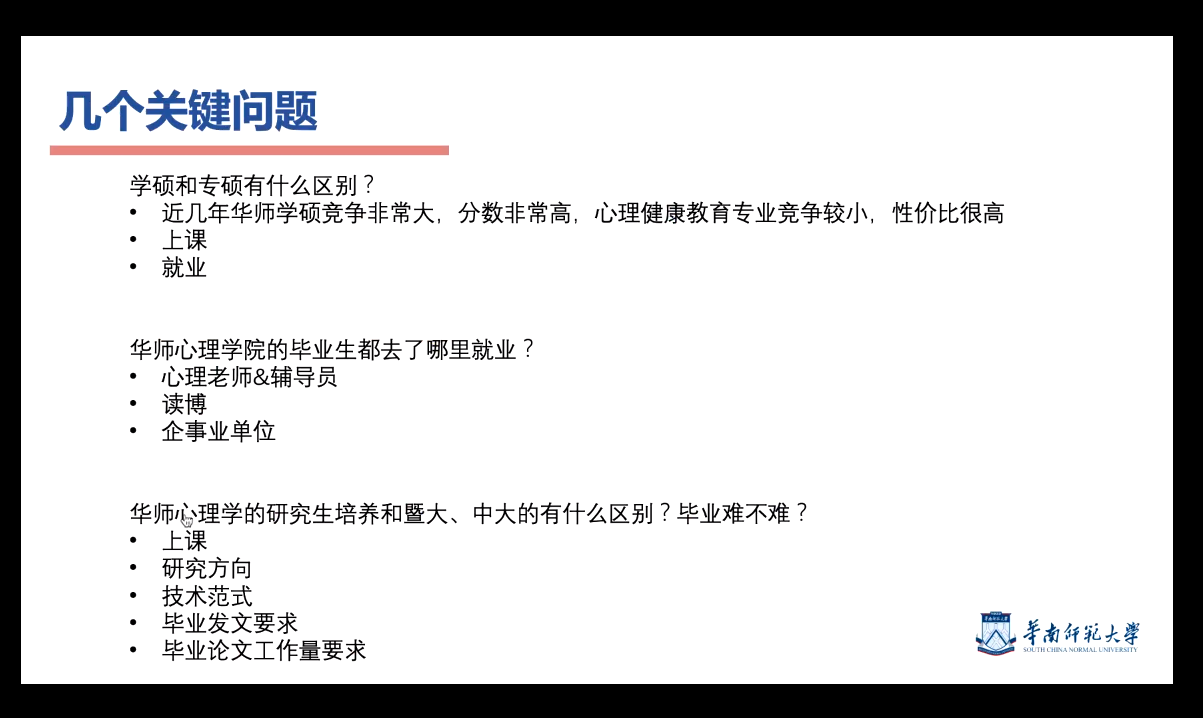 肖琦凯校友结合自己的读研经历,对学硕和专硕的区别、华师心理学院毕业生的就业去向、院校间心理学专业硕士培养的区别三个关键问题进行分享。此外,他还分享了自己找工作的心得。他表示,要先看工作描述,在此基础上补充自己的相关经历和技能技巧,多投简历、积累经验,练习行测、无领导小组讨论、结构化等招聘方法,提高自己的求职能力。