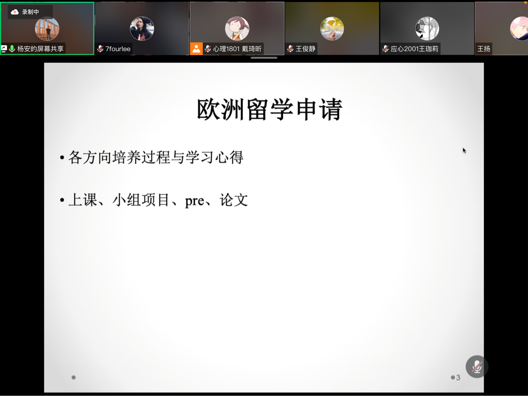 2021年7月7日下午14点,英国正版365官方网站应用心理学系通过腾讯会议开展了职业生涯规划系列讲座(一):出国(境)留学篇讲座。主讲人为应用心理学系毕爽老师、杨安老师和刘方松老师。会议由应用心理学2001班陈雨桐主持,心理学系全体本科生和研究生参加了此次讲座。