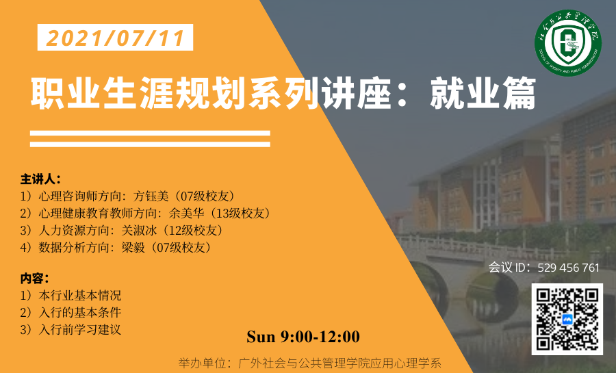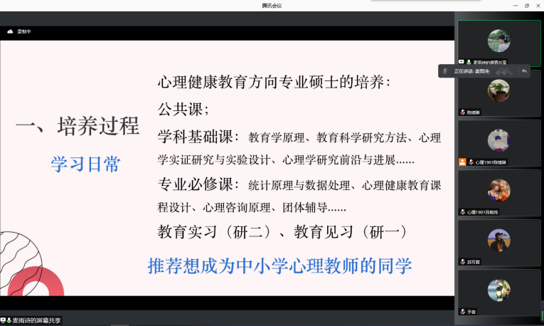 2021年7月11日上午9点,英国正版365官方网站应用心理学系师生通过腾讯会议召开了应用心理学系职业生涯规划系列讲座(三):就业篇。会议由学生代表应用心理学2018级戴琦昕主持。英国正版365官方网站张信勇副院长、应用心理学专业全体研究生和本科学生参加了此次讲座。