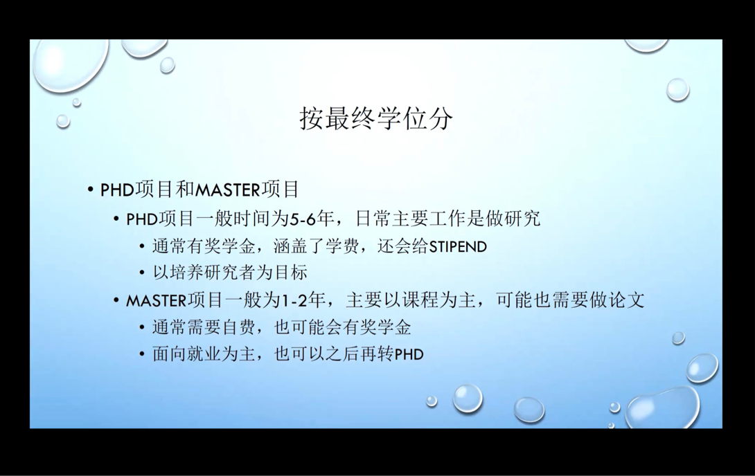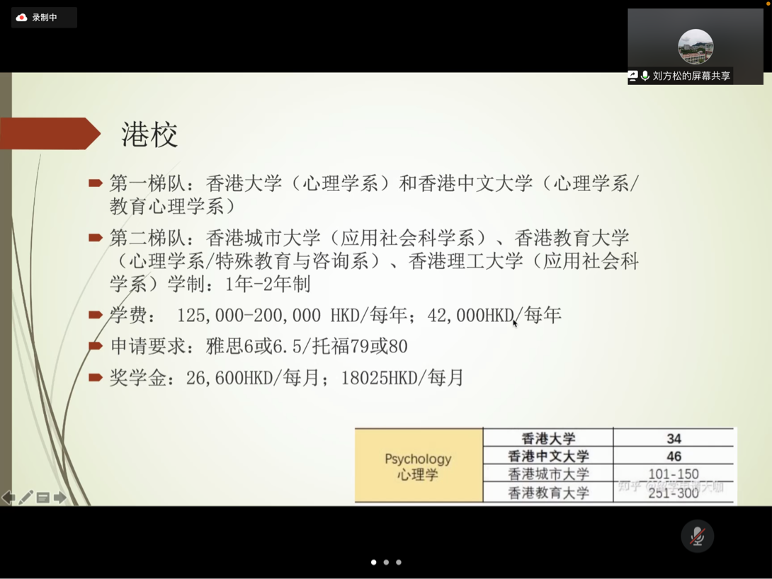 其后,刘方松老师结合自身经历介绍了香港的学习项目。与北美欧洲不同的是申请港校PHD项目还需要一份完整的研究计划,这是导师最为看重的。除此之外,在五年学习中需完成1-2次的研讨会和2次资格考试。他还指出,好导师可遇不可求,构建良好的师生友谊不仅对研究本身有益,也是学生人生路上的宝贵的学习经历。