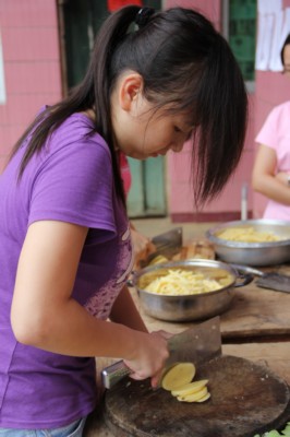 张渝萍:这种的话,很多种情况都可能出现,就像今天,因为后勤组没有留下来的男生,两个女生在抬灶上乘着汤的大锅的时候,就被火烧到了手,还有,前连天切菜的时候就有切到手,等等。都是这类的小伤咯。
