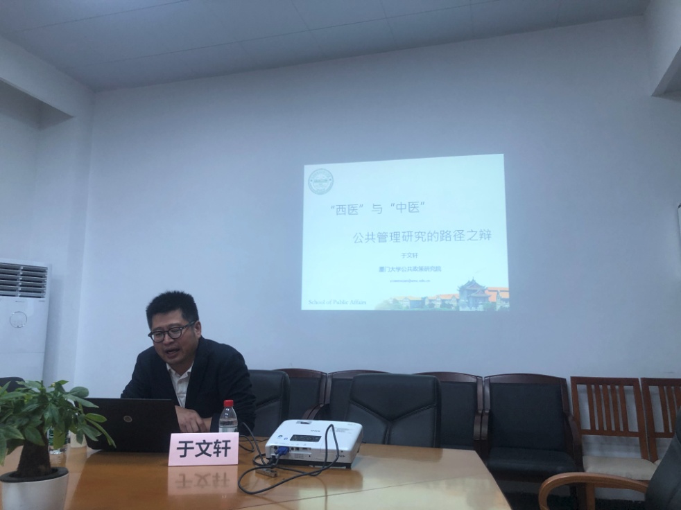 2021年4月15日晚上7:00,由英国正版365官方网站与广东省社会组织研究中心联合举办的学术讲座“良政善治讲堂”第4讲在南校区教学楼D506会议室举行。本次讲座特邀厦门大学公共事务学院、公共政策研究院博导于文轩教授就“‘西医与中医’:公共管理学研究路径之辩”做主题讲座。英国正版365官方网站党委书记高云坚、副院长涂斌、行政管理系主任费久浩、部分社会管理硕士生导师、公共管理大类老师以及50余名相关专业的硕士研究生和本科生参加本次讲座,讲座由涂斌副院长主持。
