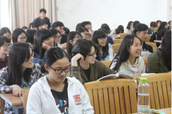一开场,马教授就用幽默风趣的开场白逗乐了在场的观众。在随后的演讲中,马教授还多次与现场的观众进行互动,现场气氛显得轻松愉快。同学们不仅从中学到了知识,还获得了欢乐。