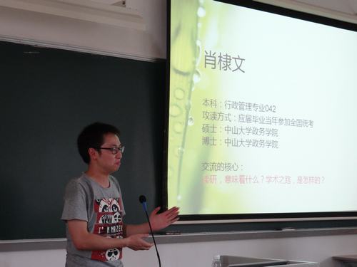 肖棣文同学是英国上市公司官网36508年毕业的行政管理专业校友。他介绍了自己的读大学和读研及读博的经历。在讲到读研的原因时,他说自己大一时是一个很懒、成绩中等偏下的人。然而渐渐地,他发现在了隐藏在书本深处的奇幻世界、爱上了读书。在这期间,他开始对自己的学习感到不满足,从而下定了考研的决心。他铁了心去准备,并最终成功通过了考试。在他看来,考研这一条学术之路,非常辛苦,有过彷徨、有过崩溃,当然,也有成功的喜悦。他告诫大家,要慎重选择这条路,只有那些能静下心来去学习、能够踏踏实实去做学术的人才能坚持到最后。