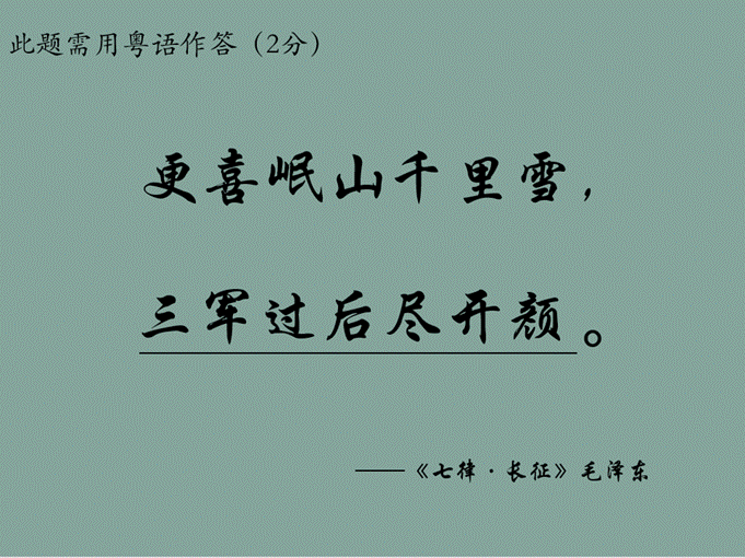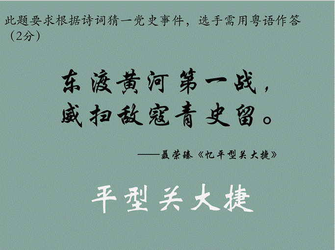 值得一提的本次活动的特色之一——粤语党史竞猜环节。为庆祝中国共产党成立一百周年,带领同学们“学党史、强信念、跟党走”,本次活动增设了党史竞猜环节,将党史学习融入语言文化的学习中。看图猜党史并用粤语作答的学习形似让同学们在有趣的游戏中传承党史力量,而竞猜党史诗歌环节不仅让同学们体会到了粤语诗歌之美,也让同学们对党,对国家有了更多的了解。