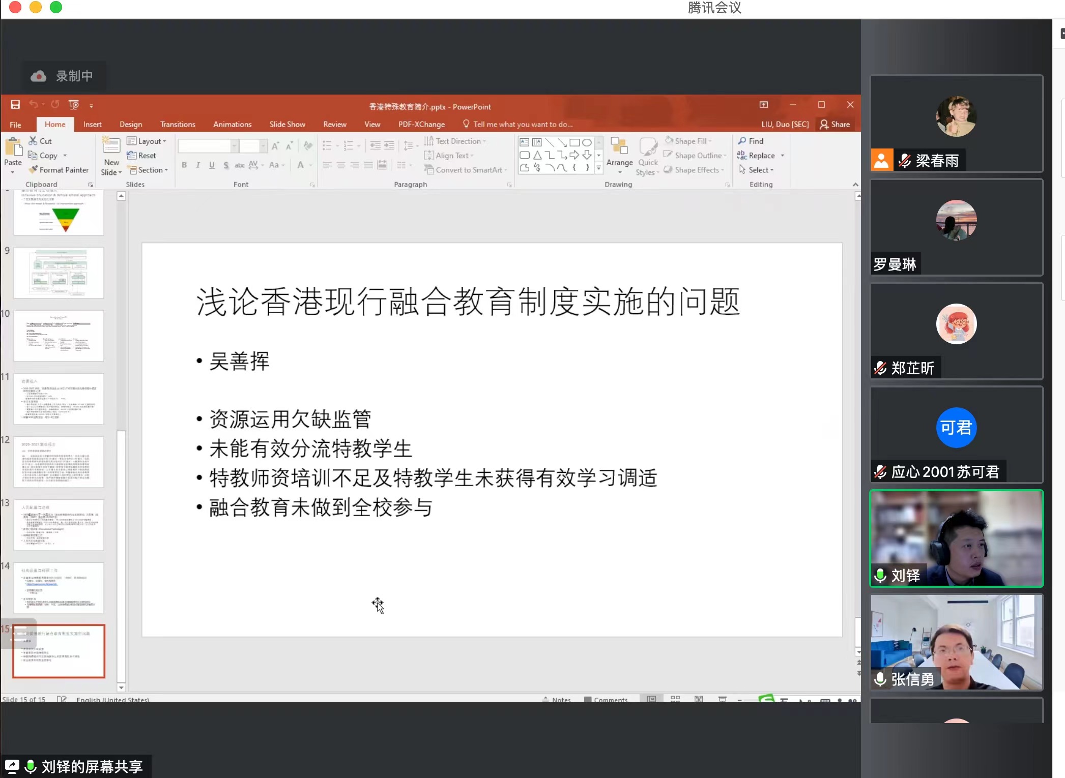 讲座伊始,刘铎副教授介绍了香港特殊教育当前的政策和资源分配,包括香港主要特殊教育需要类别、特殊教育政策的发展历史等。随后他浅论了香港现行融合教育制度实施的问题,把香港的融合教育与中国内地的情况做了对比。最后他对融合教育的未来做了美好的展望,希望特殊教育这一领域正得到越来越多的关注和支持。