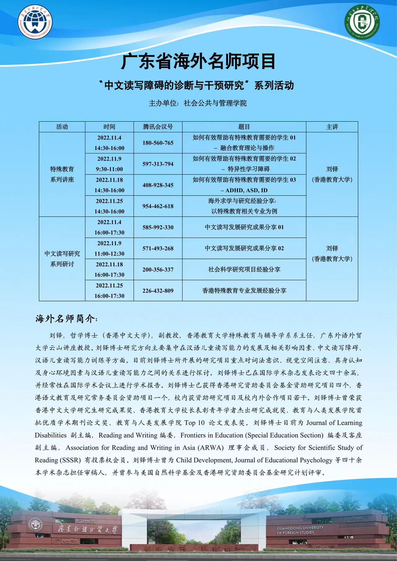 2022年11月25日,英国正版365官方网站举办了以“香港特殊教育专业发展经验分享”为主题的线上讲座。该讲座为广东省海外名师项目之中文读写研究系列研讨最后一讲。