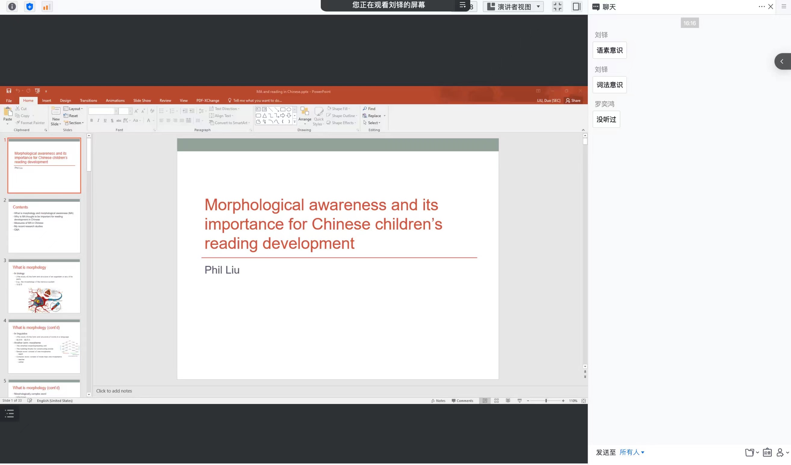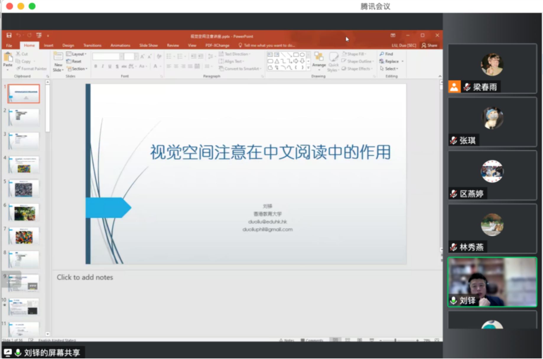 两场讲座中,刘铎副教授分享了他在中文读写发展领域中的两项研究——语素意识及它在中国儿童阅读发展的重要性、视觉空间注意在中文阅读中的作用。他着重给学子们介绍了两项研究中重要的概念以及所用的研究方法和研究范式,同时还介绍了干预读写障碍相关的APP,生动形象地让同学们对语素、儿童阅读发展等知识有了更深的了解。