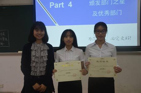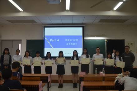 最后进行的是优秀部门和部门之星的颁奖仪式。房瑞佳老师和白志华老师为获得荣誉的同学们颁发了奖状并合影留念。至此,本次团学总结大会落下帷幕,为上一学期的团学工作画上圆满的句号。