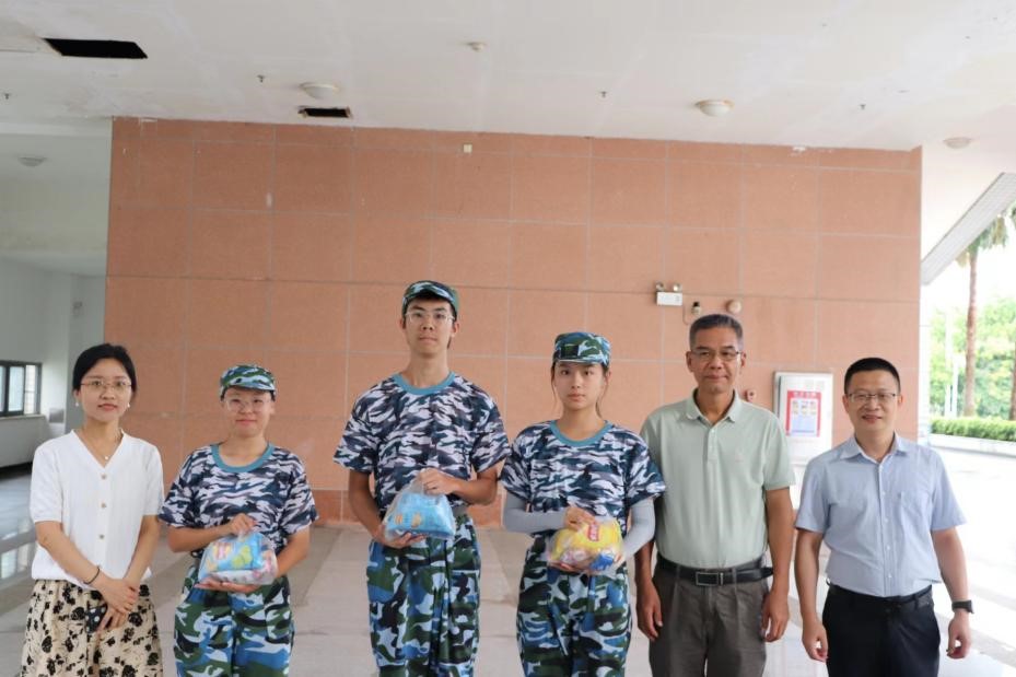 随后高云坚组织员为军训期间过生日的两位同学送上生日贺卡,以及高云坚组织员、陈胜副院长、王俊静系主任分别给各班新生代表送上慰问品,带去了学院真切的关怀和鼓励。