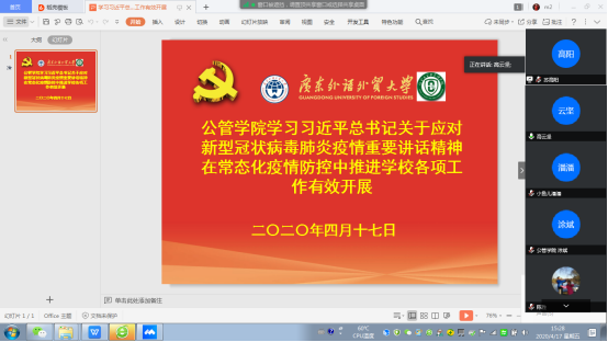 高云坚首先带领大家学习了中共中央政治局常务委员会4月8日会议精神,给大家解读了习近平总书记关于坚持在常态化疫情防控中加快推进生产生活秩序全面恢复,抓紧解决复工复产面临的困难和问题,力争把疫情造成的损失降到最低限度,确保实现决胜全面建成小康社会、决战脱贫攻坚目标任务的指示精神。按照习近平总书记的要求,主要是做好在常态化防控中恢复生活秩序、复工复产复学,确保防疫发展两不误,坚持底线思维,外防输入内防反弹。高云坚还就学院近期主要工作的推进作了强调,要求全院上下要切实按照中央和学校党委要求做到防控疫情和做实工作两手抓,两手都要硬。彭未名院长谈了疫情防控的总体趋势,肯定了学院社会工作、应用心理专业在疫情当中体现出的专业价值和社会服务精神,希望学院全体干部以此为契机,进一步推进国家一流专业和硕士点申报工作。
