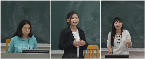 在付院长的解说之后,来自12级留学归来的嘉宾们也和同学们分享了她们的留学之旅。她们分别来自美国肯塔基州立大学,韩国仁荷大学,澳洲昆士兰科技大学。师姐们主要在学业,生活方面与大家进行了经验交流,也介绍了大家关心的出国经费状况。她们认为在国外学习的机会很宝贵,要努力学习,融入集体生活很重要。