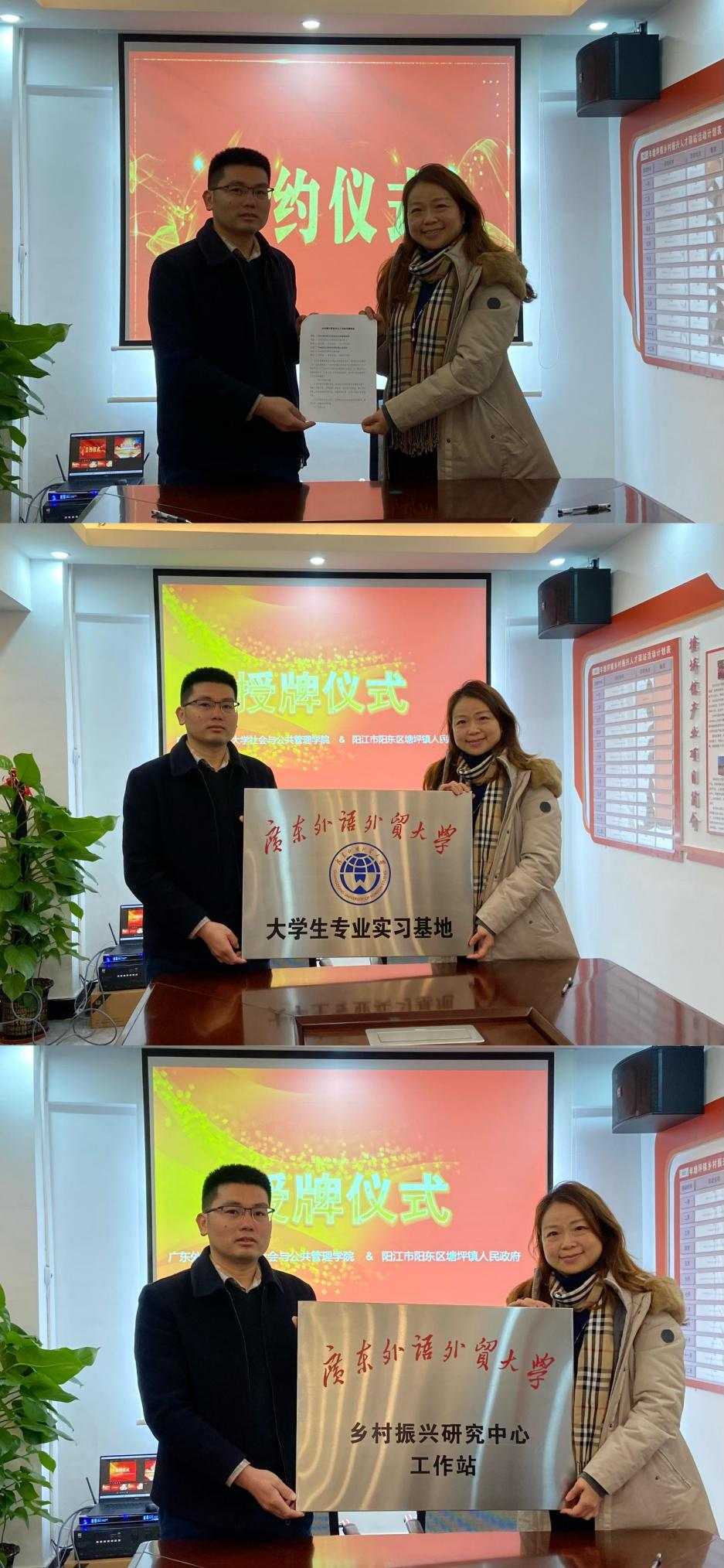 涂斌院长和谢明君副书记签订“大学生专业实习基地”和“乡村振兴研究中心工作站”协议并进行授牌。