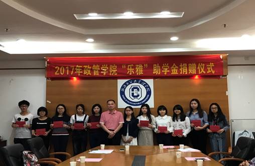 2017年4月28日上午9:00,在院系楼426举行了2017年政管学院乐雅助学金捐赠仪式。参加本次捐赠仪式的有院长彭未名、副院长毛国民、党委副书记邵兵、团委书记房瑞佳、辅导员白志华、陈胜老师。捐赠者有吴旭东先生和他的女儿吴雅婧以及政管学院的各届受助学生。
