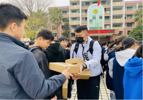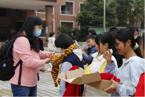 活动当天上午,志愿者们经过3个小时的车程,到达了横石水中学。首先,横石水中学校长致欢迎词,对参与本次活动的各志愿者团队表示感谢。接着,信息时报公益事业部总监黄莺跟山区学生们分享了关于“针心针意”的故事,她跟孩子们说道:“这些围巾、帽子、手套是那些跟你们素不相识的志愿者哥哥姐姐、叔叔阿姨在忙碌的生活中,挤出时间,为你们一针一线编织出来的。暖冬盲盒里面还有护手霜、书籍、春联等小礼物,每一样都是志愿者们精心准备的。他们希望你们可以健康成长,希望你们越来越好,而我也希望你们能够珍惜这份爱,把这份爱传递下去!”最后,志愿者们开始派发盲盒,收到暖冬盲盒之后,学生们迫不及待地打开了盲盒,有的学生在试戴围巾,有的学生在涂护手霜,有的学生看完自己盲盒里面的礼物之后,好奇地看看其他同学的盲盒,还有的学生认真地看着盲盒里面的祝福卡……孩子们脸上露出了灿烂的笑容。