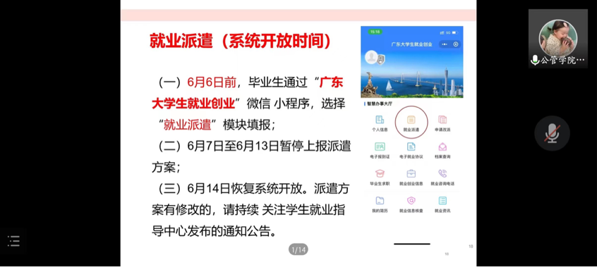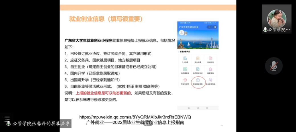 会议第一部分是就业信息填报。就业相关手续的办理在广东大学生就业创业小程序进行,仔细讲解了有关完成电子协议、就业创业信息等消息流程与需要注意的细节。