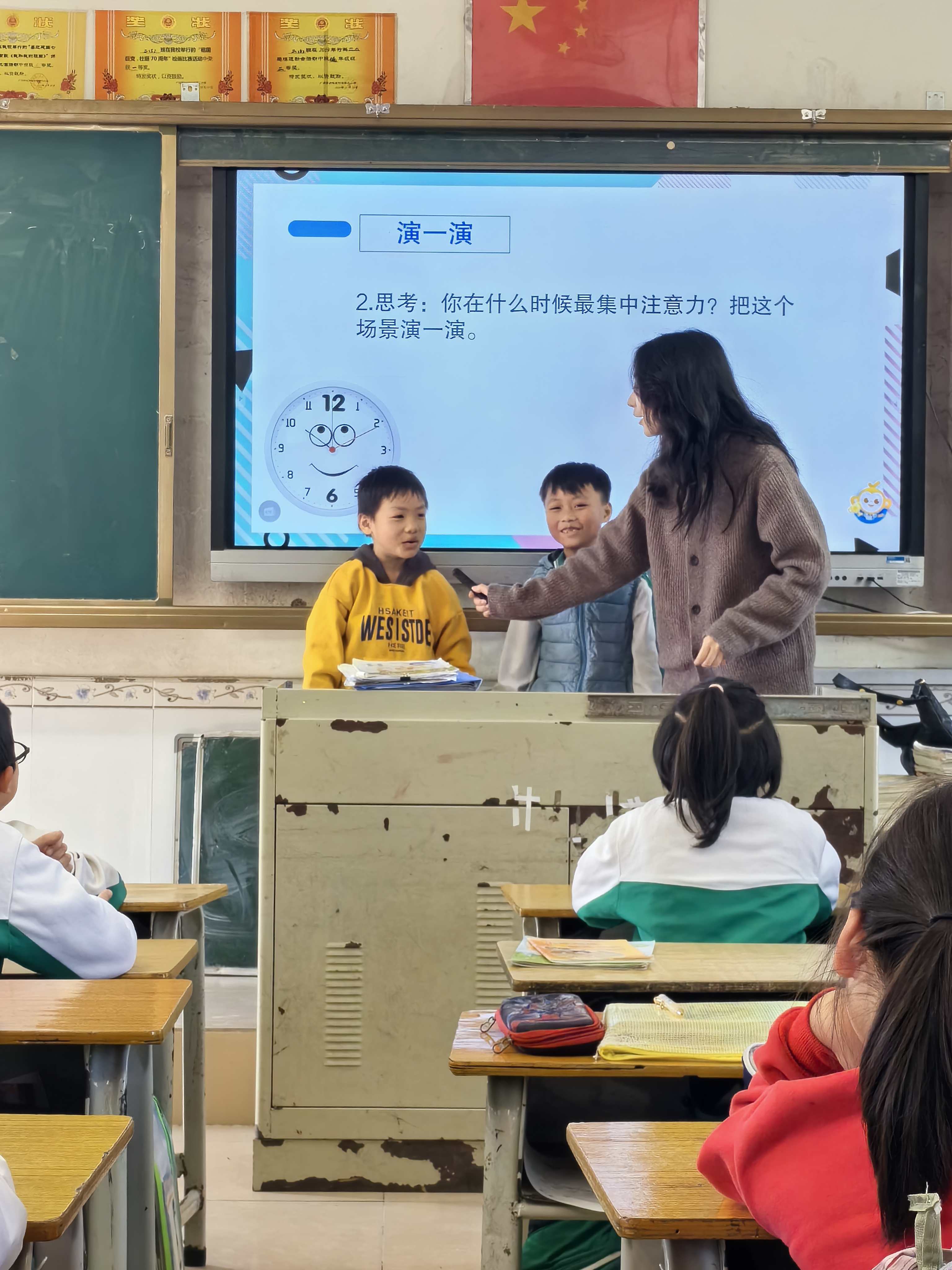 活动当天下午,英国上市公司官网36523级应用心理专硕研究生苏怡西以“心理聚光灯——提升注意力”为主题开展提升注意力专题课堂,通过“游戏”与“角色扮演”“闯关”等环节进行听觉训练、视觉训练和触觉训练,引导小朋友们提高注意力要做到“小耳朵,竖起来”“小小手,动起来”“小眼睛,看过来”。整个课堂气氛十分活跃、互动频繁。
