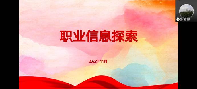 首先,张信勇院长从职业世界地图、PLACE模型以及探索职业世界的方法三个板块进行职业信息探索。张院长强调了求职需要找准方向,才能找到更好的自己。他指出,在就业时,可以优先选择国家战略新型行业或者政策导向职位,让同学们关注兴起职业,给同学们指明求职的方向。